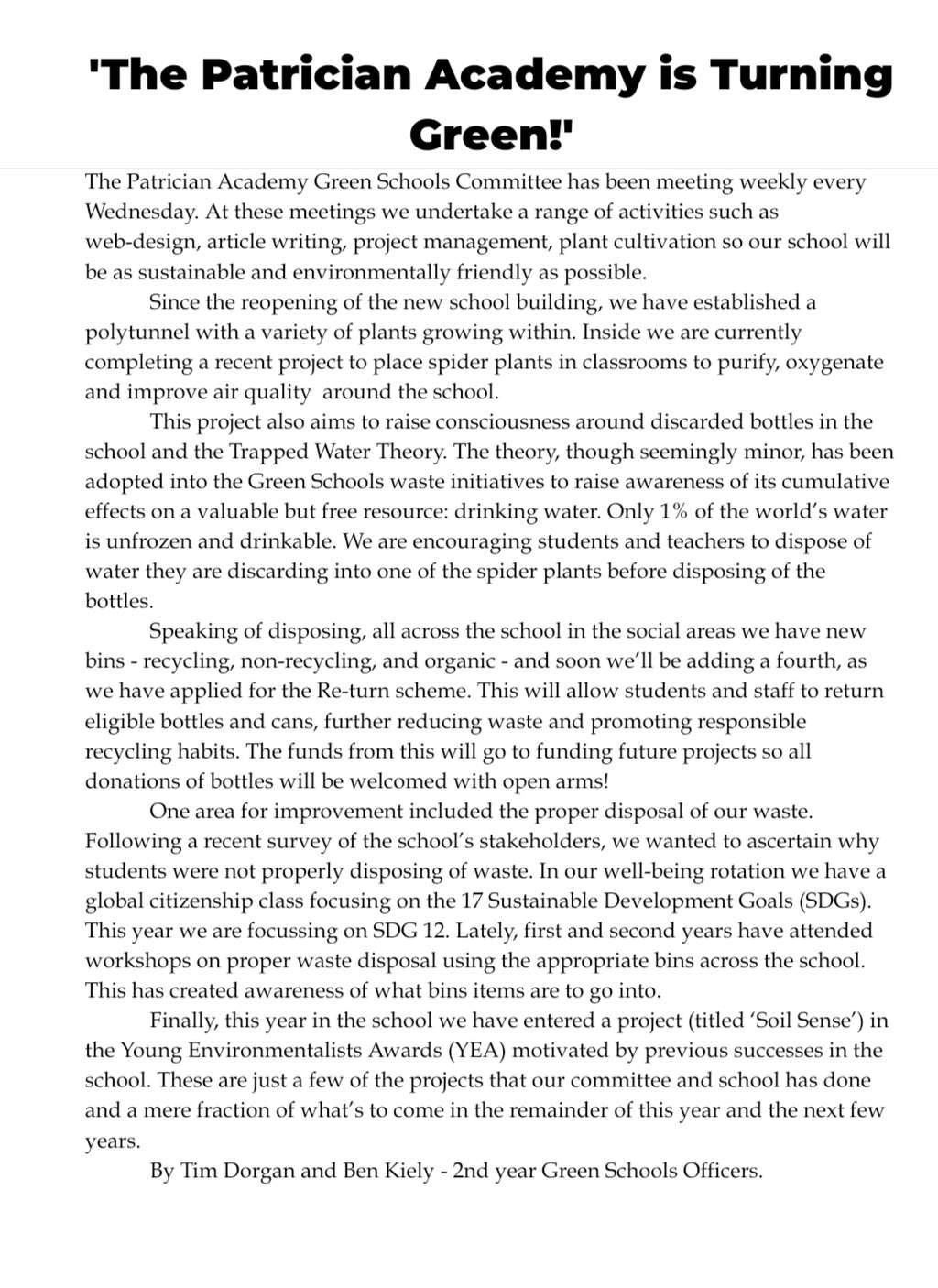 Our Green Schools Committee are doing a fantastic job across the school as they meet weekly to make our school a more sustainable and environmentally friendly place for everyone .Find out more info about what the committee does by reading the article in this post written by Ben Likely & Tim Dorgan in 2nd year.
