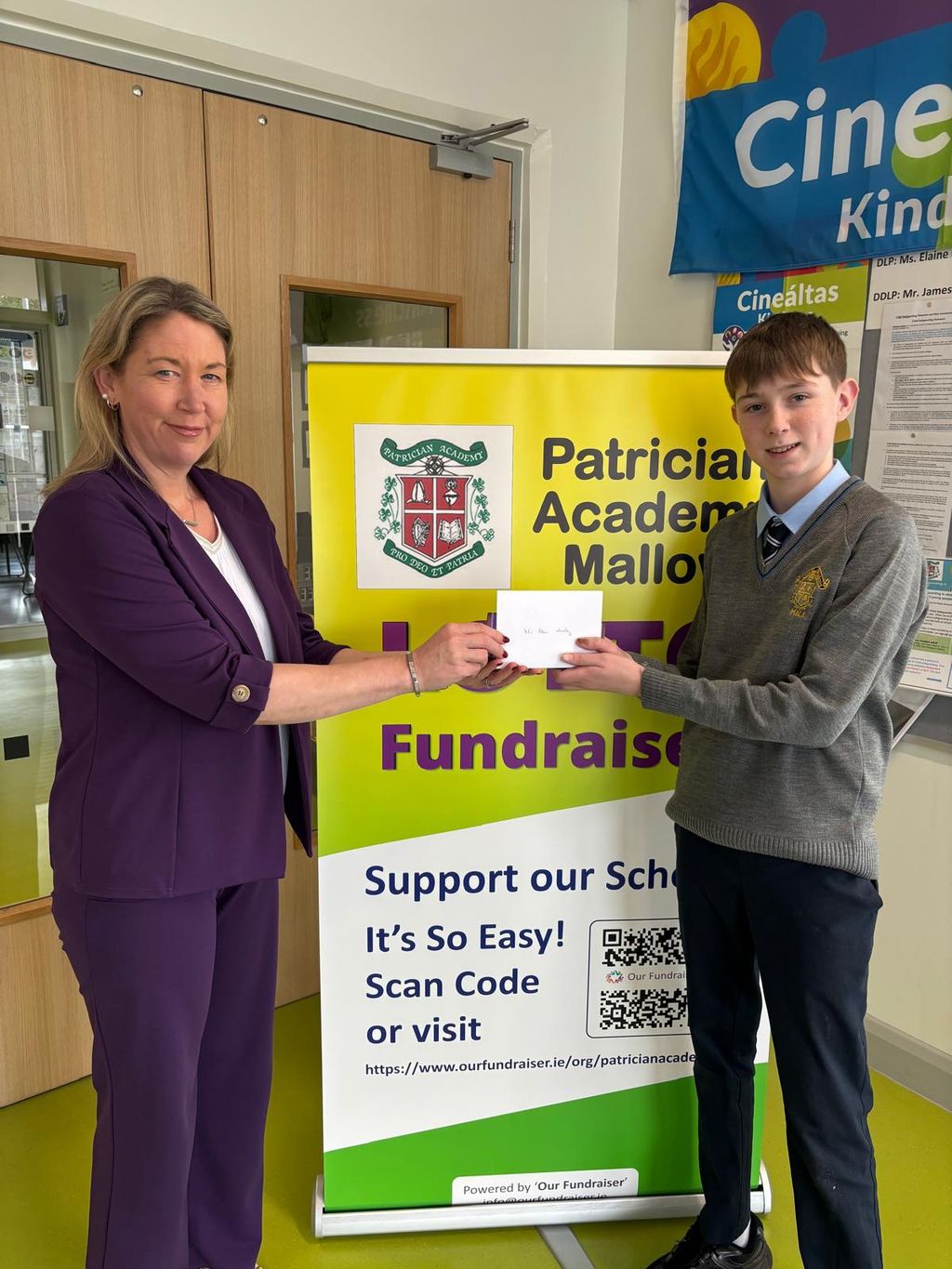 Congratulations to our recent lotto winners: Ger Walsh, our Christmas winner, whose son Cillian is pictured accepting her prize from Ms O’Regan, Alan Whooley, whose son Conor in 2nd Year is also pictured accepting his prize, Bronagh Luddy, mother of Ronan in 6th Year and Miriam Deane, mother of past pupils Billy and Garry, who won two weeks in a row.